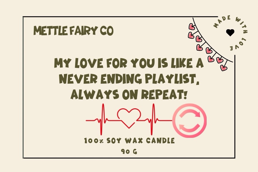 “My Love for You is Like a Never-Ending Playlist, Always on Repeat” is a 100% organic soy wax candle that’s